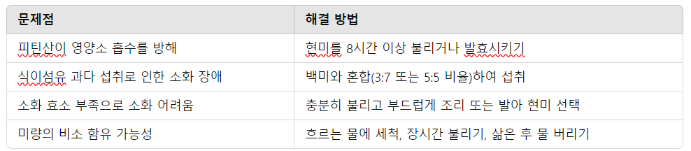 ➡ 해결책: 현미를 먹기 전 충분히 불리고 깨끗이 세척하며, 지나친 섭취를 피하는 것이 중요합니다.